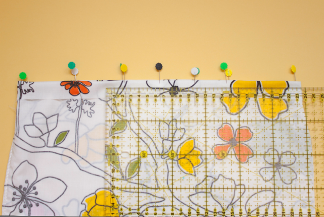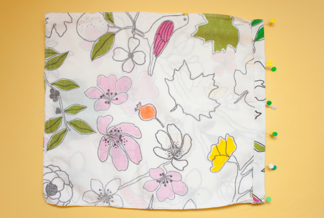 7. Coge la bolsa y estando aún del revés, haz una doblez de 2,5 centímetros en la parte que te ha quedado abierta, vuelve a doblar otra vez y sujeta con alfileres. Comprueba que la bolsa queda igual de larga en todos los lados.