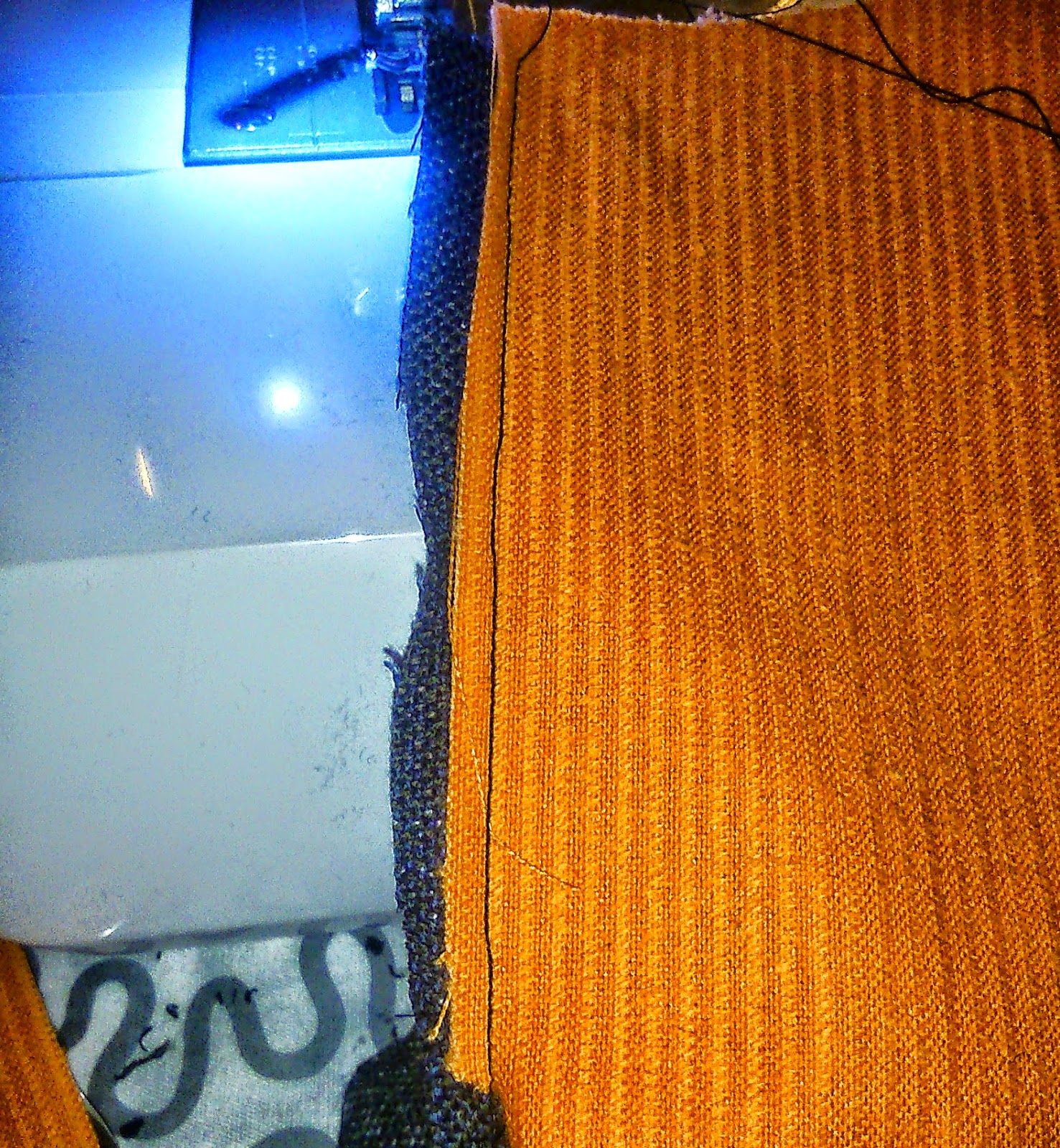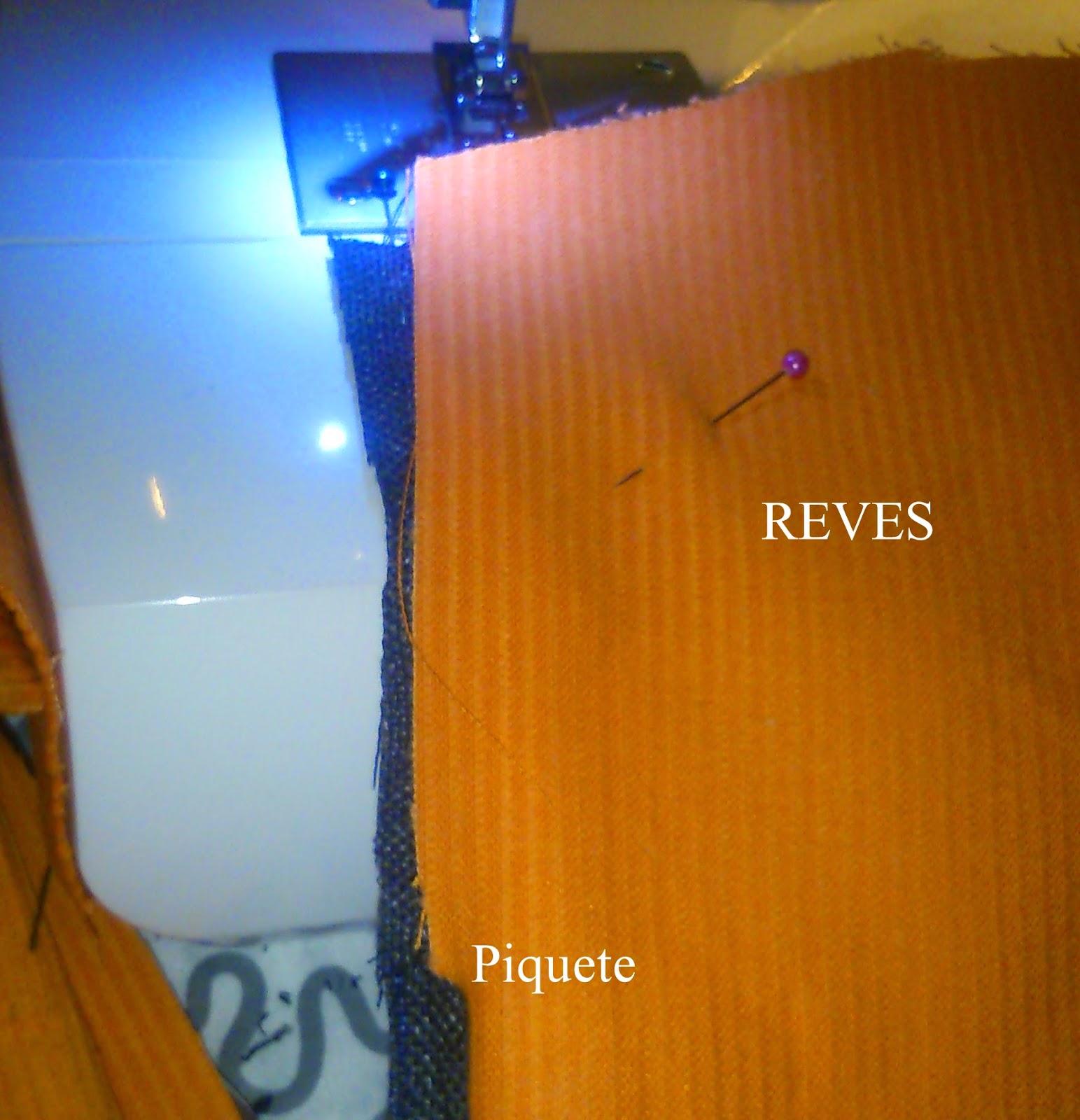 Hacemos un pespunte tal como muestra la linea de puntos naranja, desde la esquina hasta la cintura