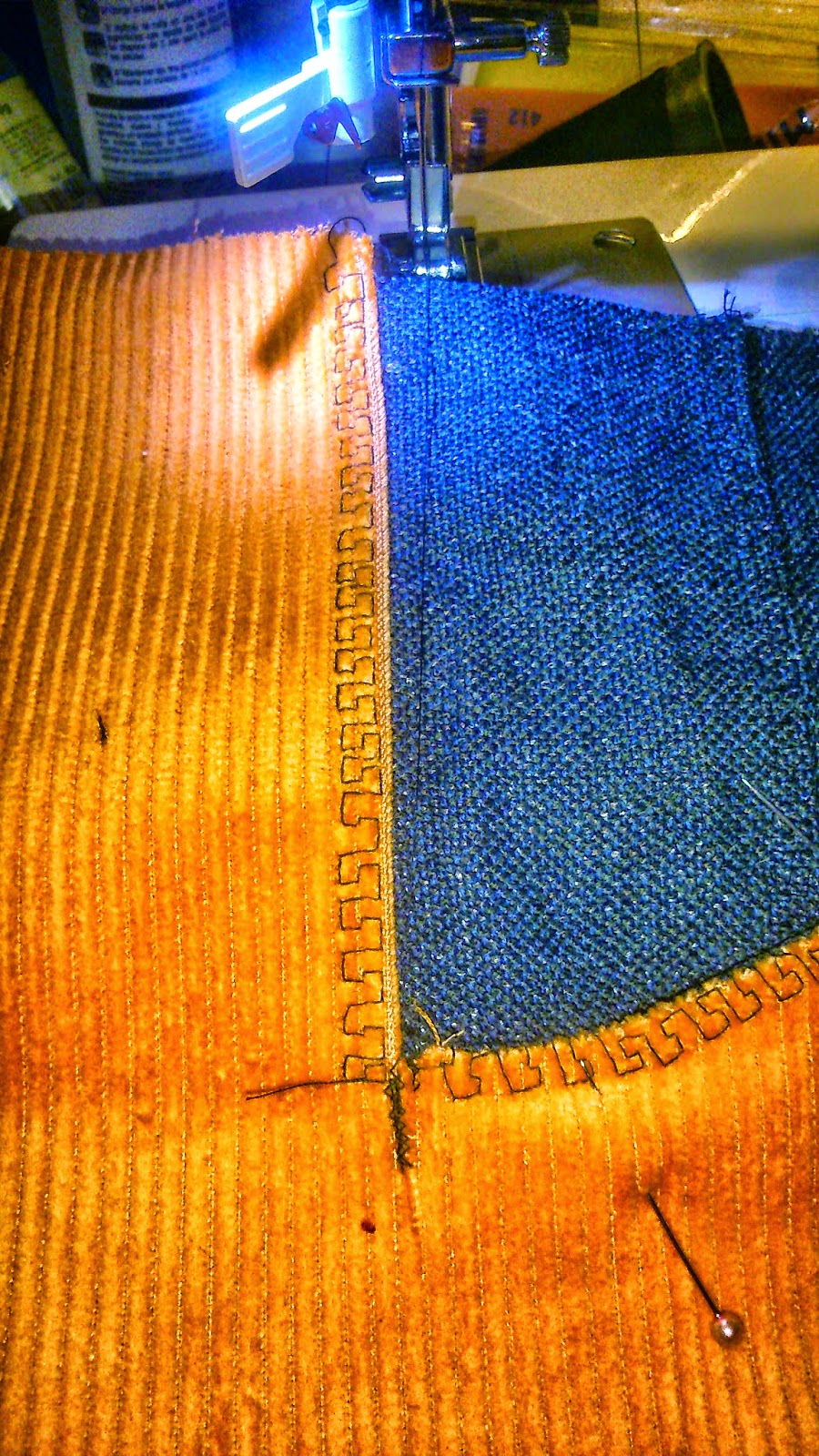 Colocamos el saco del bosillo tal como muestra la imagen derecho con derecho, de tal forma que veas el derecho del pantalón con el revés del bolsillo