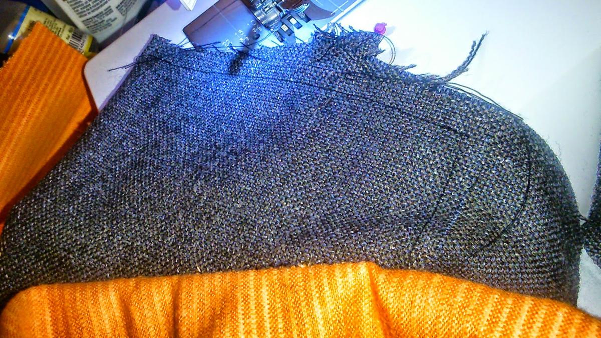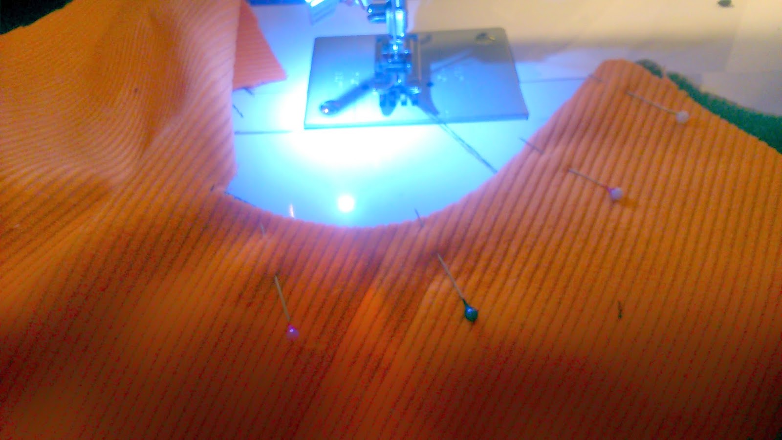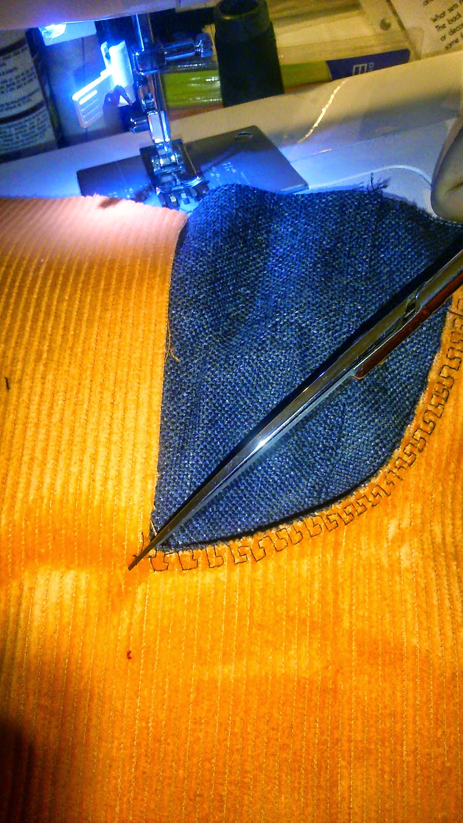 Hacemos un pespunte tal como muestra la linea de puntos naranja, desde la esquina hasta la cintura
