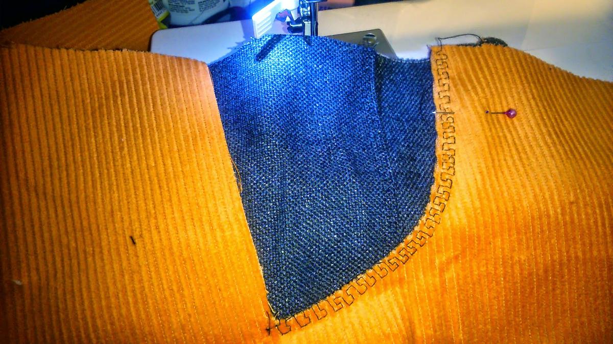 Colocamos el saco del bosillo tal como muestra la imagen derecho con derecho, de tal forma que veas el derecho del pantalón con el revés del bolsillo