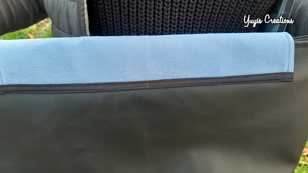 A la pieza del bolsillo le cosí el bies alrededor. También en el video te explico paso a paso cómo poner el bies para que las esquinas te queden perfectas. Luego el bolsillo lo dividí en 3 compartimentos.