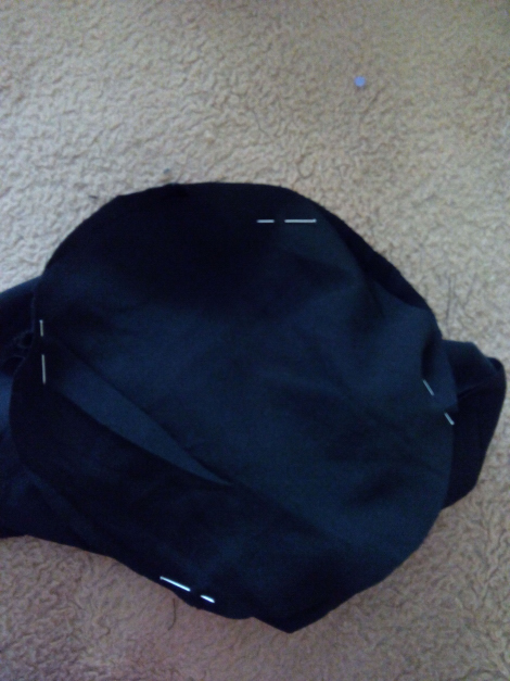 Una vez que están unidos vamos a pegarle el circulo por el lado que tiene los piquetes, deben coincidir dos piquetes con las costuras laterales del rectángulo y dos piquetes con la mitad del rectángulo.