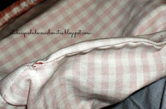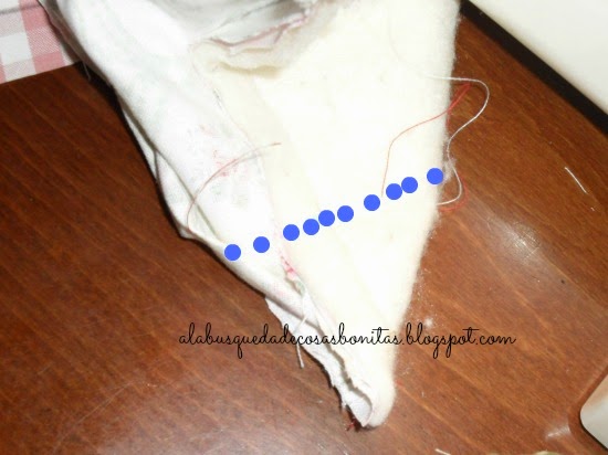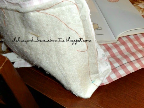 A continuación, rellenamos las asas, con miraguano de cojines o también, si sois como yo que lo guardo todo, con los recortes que sobran cuando acolchamos algo... Y a las malas, con algodón...