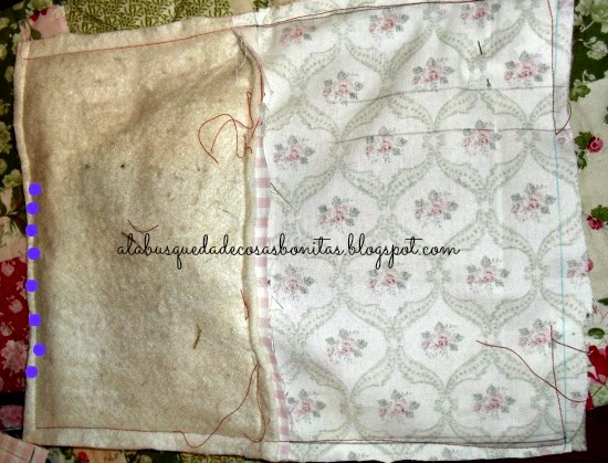 Ahora, abrimos las dos piezas, y ponemos las dos partes derecho con derecho (como en la foto), y pasamos un pespunte por todo el borde, dejando un trozo sin coser como os he marcado en la foto, en la parte del forro, para que podamos darle la vuelta:
