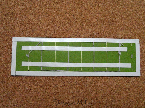 Para evitar confundirme realizo primero el bordado de un color y después el del otro. Una vez terminado el bordado hay que pegar la otra cartulina por la parte de detrás para tapar la parte "fea" que no ha de verse. Uso cinta de doble cara para que el pegado sea lo más efectivo posible y el borde quede sellado completamente.