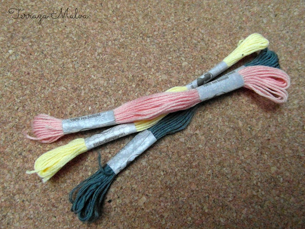 Para el bordado he utilizado hilo de algodón del que se suele utilizar para bordar en punto de cruz. Cada cabo de la madeja está formado por seis hilos trenzados. Yo utilizo sólo dos de los hilos separándolos del resto, pues si no el bordado quedaría demasiado grueso.