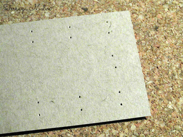 Una vez cortadas las cartulinas se sitúa una de ellas bajo el diseño de los puntos. Puede sujetarse con un poco de cinta para mantenerla en su posición. Con un alfiler (o una aguja) se van marcando todos los puntos de manera que se perfore completamente la cartulina.