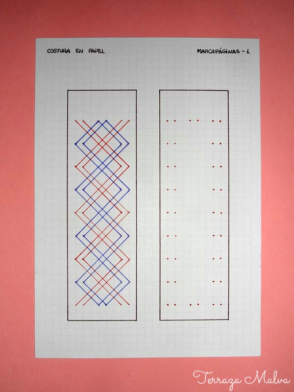 Para ayudarme en el diseño he utilizado un papel cuadriculado. Dibujé la medida que quería para mis marcapáginas (15 x 4,5 cm) y dentro situé el motivo. He utilizado rotuladores diferentes para distinguir los distintos colores de hilos (en este caso dos colores). Después marqué en otra figura los puntos que se tienen que perforar para insertar el aguja en el papel.
