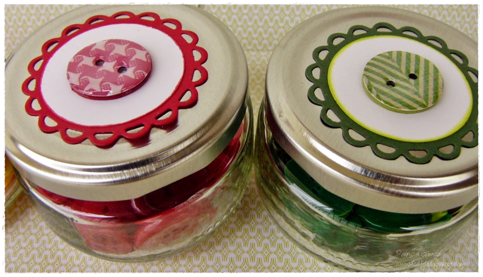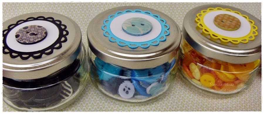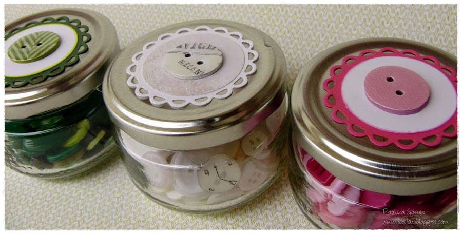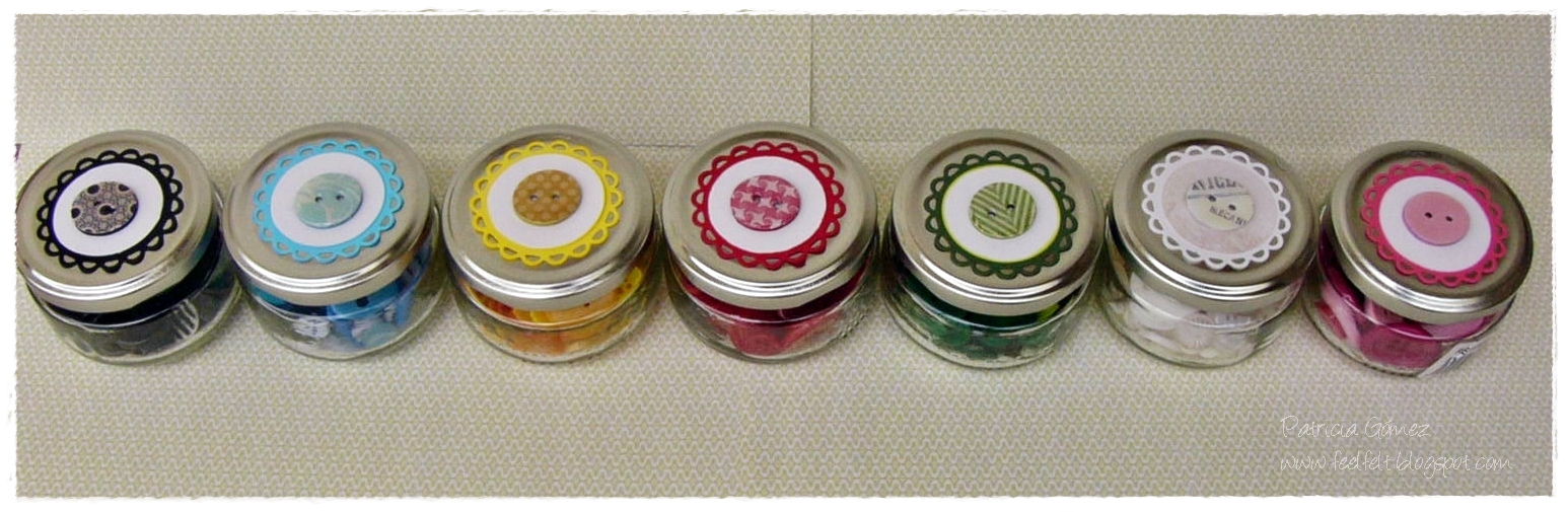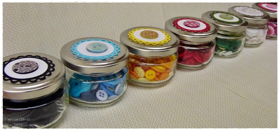Y ya tenemos unos botones caseros, originales, baratitos (sobre todo si tenemos el troquel) y a juego con el trabajo que queramos. Yo en esta ocasión los quería para colocar sobre cada uno de los tarritos en los que almaceno los botones, y poder ver de un vistazo la selección de color deseada.
