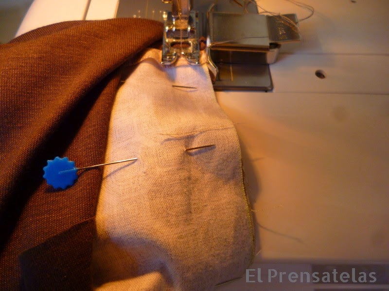 5. Emparejando los bordes, fijar con alfileres y coser los bordes cortos, a mi me gusta coserla desde la costura central a uno de los extremos y después la otra mitad, es como más sencillo me resulta, pero también podemos hacerlo de una vez:
