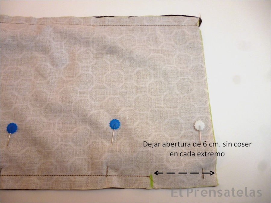 2. Fijamos de la misma manera los otros bordes largos pero esta vez a la hora de coser dejamos una abertura de unos 6 cm. en cada unos de los extremos:
