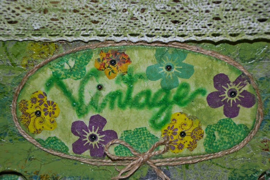 - Ahora pasamos a la decoración de la parte central de la caja, el adorno ovalado que tenemos preparado con la palabra VINTAGE, lo pegamos en el centro de la caja y lo rodeamos con el resto de cuerda, la vamos pegando haciendo un pequeño lazo para hacer el final.