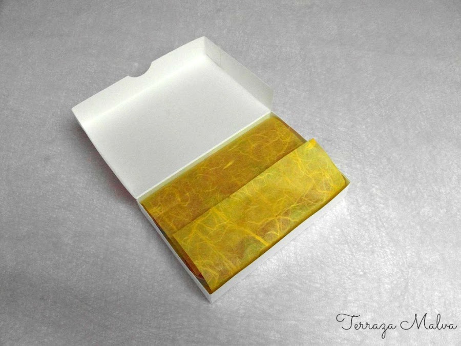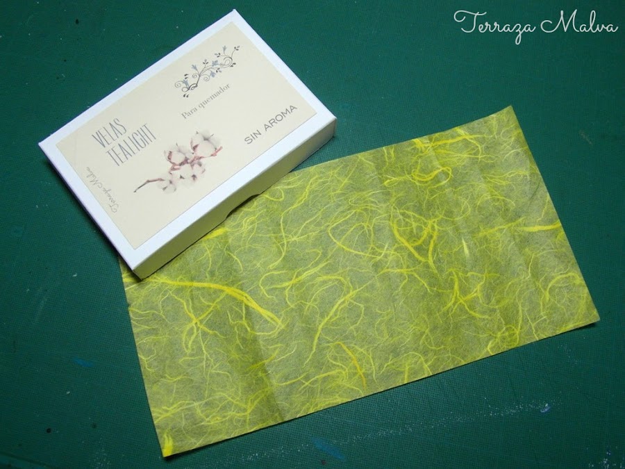 Para completar el empaquetado he cortado un rectángulo de papel vegetal con fibras que envolverá las velas.