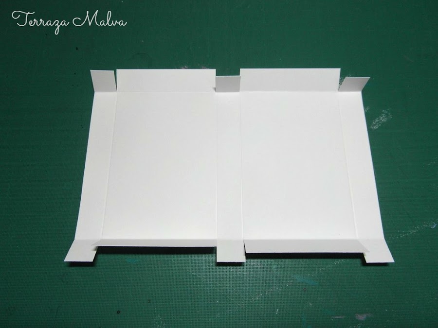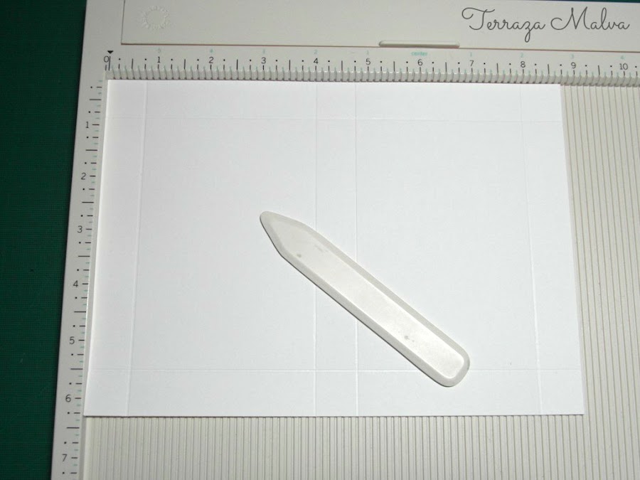 Una vez se ha cortado la cartulina a la medida, se han de trazar las líneas de plegado. Yo tengo una base de plegado, la Scoring Board de Martha Steward de la cual hice una revisión en esta entrada, pero no es necesario utilizar una base, pues las líneas de plegado son paralelas a los bordes del papel y pueden realizarse las marcas con la parte que no corta de las tijeras o con un bolígrafo de bola que no tenga tinta. Las marcas han de hacerse a las siguientes medidas: