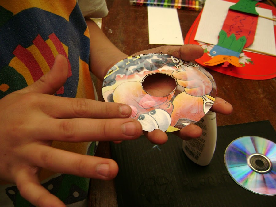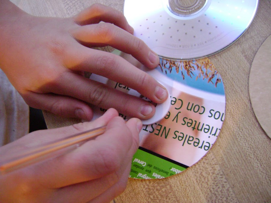 Marcar en cada uno un círculo del tamaño que está en el centro del cd, que es transparente. Con el cortador se les hace en el centro unos cortes para luego terminar de cortarlos con las tijeras.