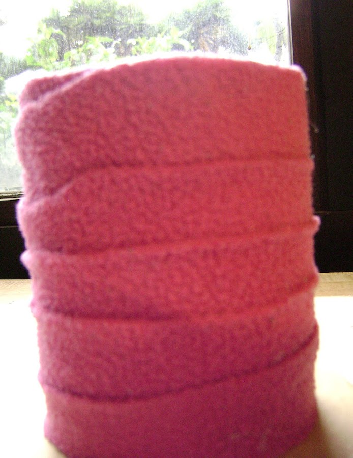 Se cortan dos tiras largas de tela y con la silicona caliente se pega cada una alrededor del tubo, dejando un pedacito por fuera como se ve en la primera foto.