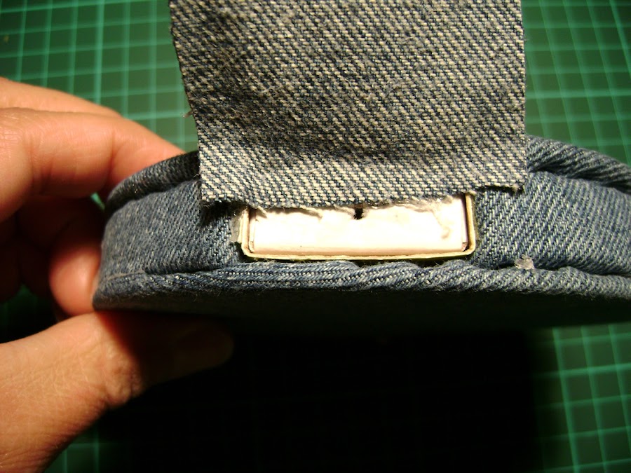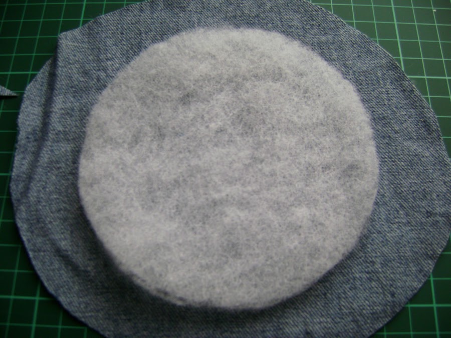 A la guata también dibujarle un círculo del mismo tamaño y cortarlo, luego se sujeta con alfileres sobre uno de los círculos de jean. Se voltea la tela y se marcan los 4 puntos donde van a ir los ojetes. Luego se ponen los ojetes pero de este paso no tengo foto porque lo mandé a hacer y se me olvidó llevar la cámara.