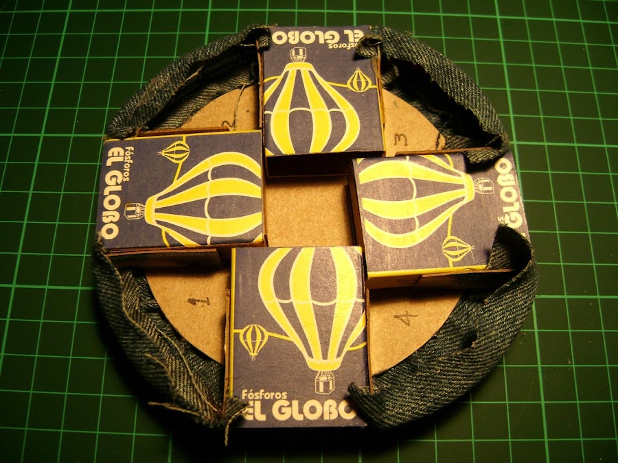 A uno de los círculos se le pega con silicona caliente uno de los cartones y luego las 4 cajas de fósforos. Debo confesar que me quedaron muy al ras.