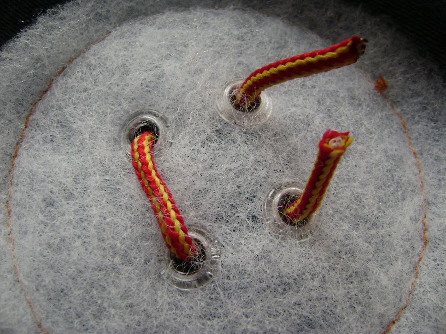 En esta foto se puede ver uno de los ojetes. Luego se dibuja un circulo más pequeño y se cose con el hilo grueso con puntada muy abierta. Este el único paso con la máquina de coser, me parece que queda más parejo, claro que lo hice muy despacio.