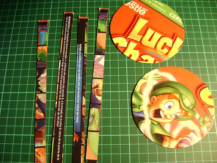 A parte se cortan 2 círculos de cartón que son como 1 cm más pequeños que los cds y 4 tiras del alto de una caja de fósforos acostada.