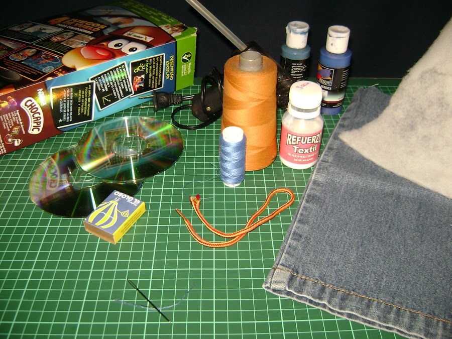 Se hilvana con el hilo grueso el círculo y se introduce el cd, luego se hala que quede bien tenso y se remata. Se hace lo mismo con el otro círculo de jean que no tiene guata.