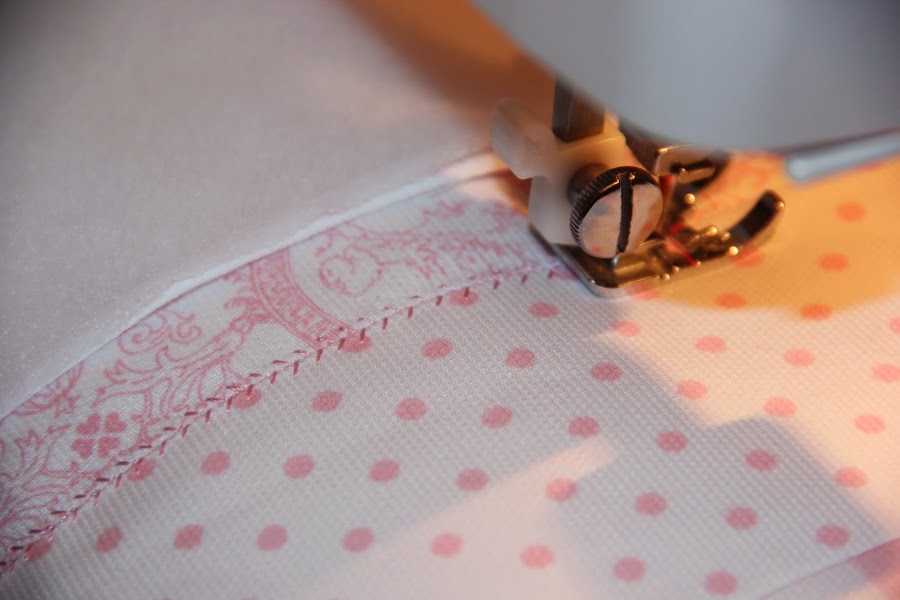 Colocar la solapa centrada sobre el derecho de las telas, tal y como se muestra en la fotografía, e hilvanar.