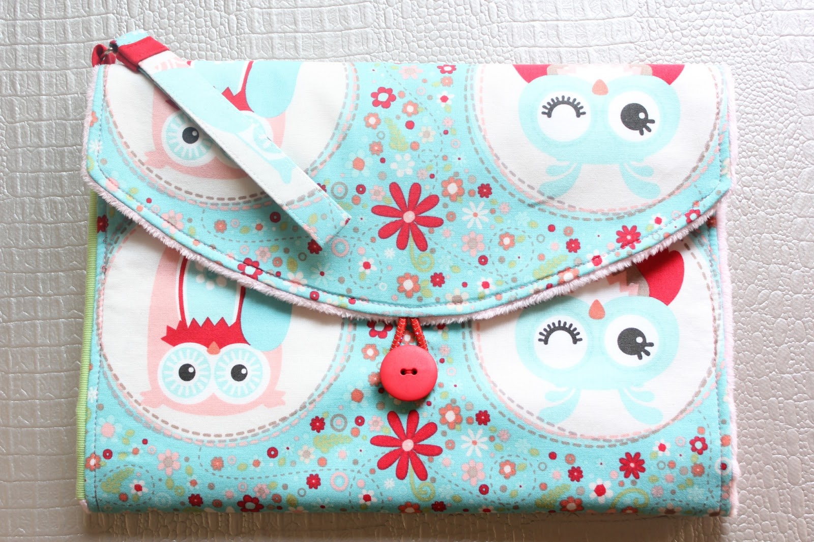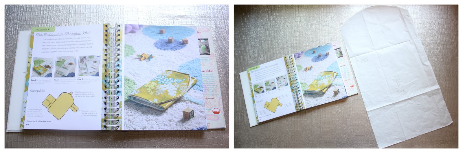 Para este cambiador me he inspirado en el cambiador "The Fashionista Changing Mat" del libro "A bag for all reasons" de Lisa Lam. Sin embargo para seguir con la temática de esta serie he utilizado tela de algodón, tela minky y felpa rizada y plastificada en vez del algodón plastificado y del vinilo. Además, he cambiado el cierre con velcro por un cierre con goma para el pelo y un botón. Finalmente, he añadido una asa para llevarlo como clutch.