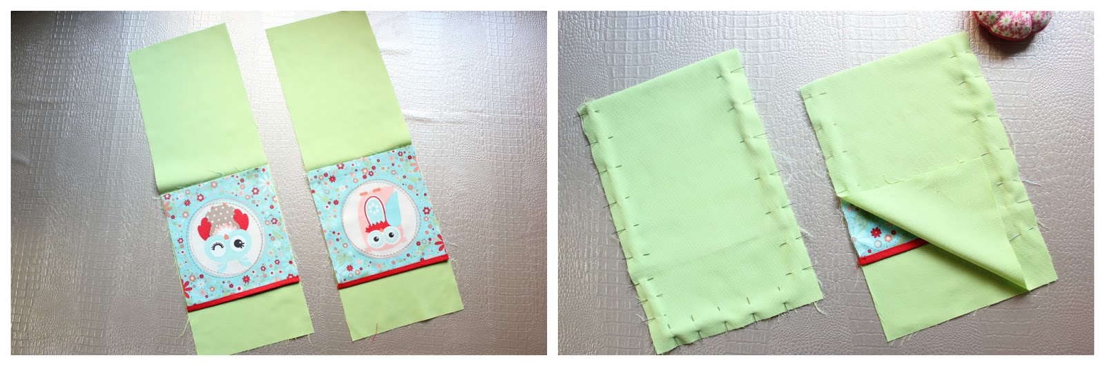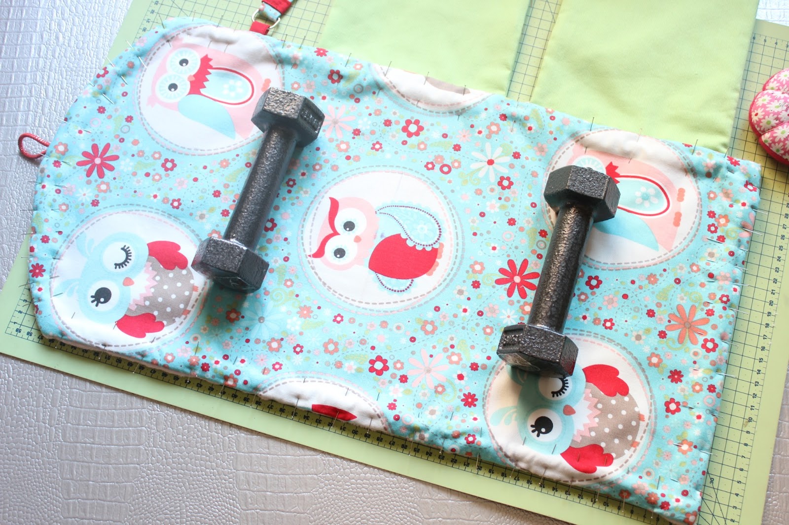 ? Doblamos hacia dentro las telas en la parte abierta del cambiador, planchamos (únicamente la tela de algodón) y sujetamos con alfileres para cerrar la apertura.