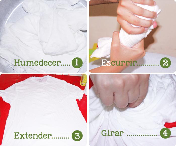 ATENCIÓN CONSEJO: Lo mejor es empapar de colores un lado y luego darle la vuelta, así nos aseguramos de que el tinte llega a toda la camiseta.