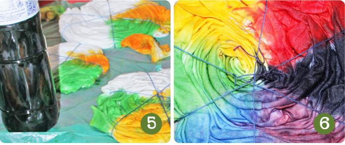 Una vez enrolladas se atan unos cordeles (hilos, gomas…) para separar dónde ponemos los diferentes colores. No hace falta que esté atado fuerte simplemente que nos sirva de guía, aunque cuanto más prieto, más sujeta la camiseta y así se mueve menos. Nosotras las hicimos de 6 colores, pero eso es al gusto de cada uno, pues se pueden poner más o menos.