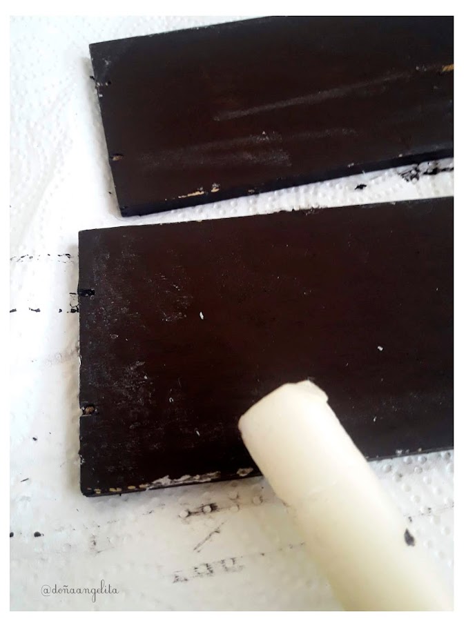 Si queréis darle un aspecto desgastado y antiguo, este es el momento de pasar cera, por aquellas zonas que te guste ese efecto. Yo he usado una vela que tenía por casa. Haz como si estuvieras rallando, aplícala por los bordes.