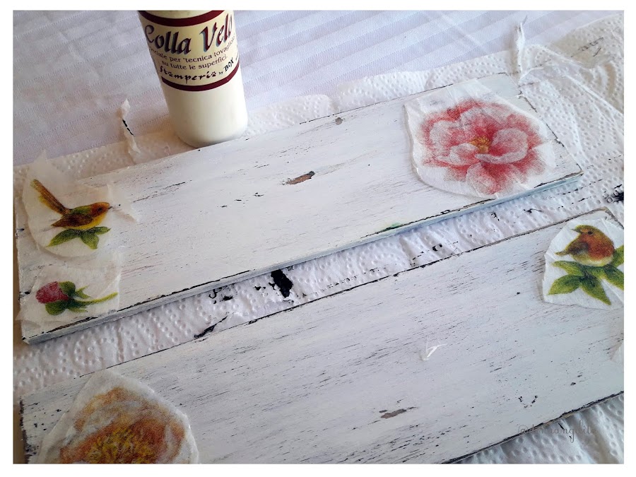 Con cola de veladura o decoupage daremos la cola, siempre desde el centro de la imágen hacia fuera con un pincel suave. Si no tenéis posibilidad de comprarla, mezclar a partes iguales cola blanca escolar y agua.