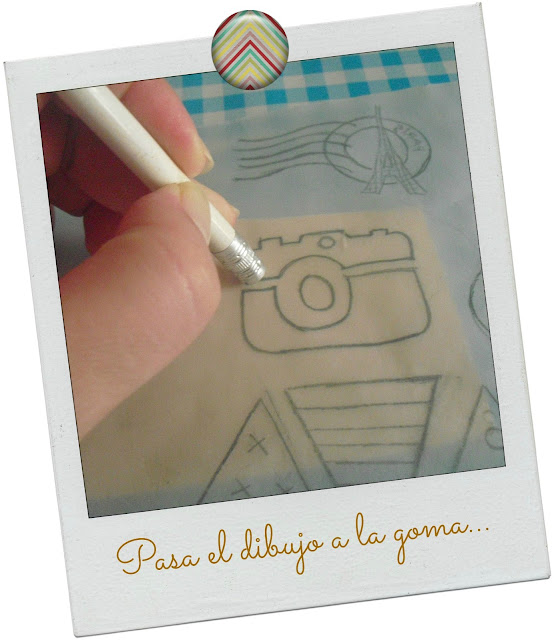 Repasad el dibujo en el papel vegetal con el lápiz, le dais la vuelta y lo presentáis sobre la goma, y presionáis, o bien con una goma, o con el dedo, esto hará que la mina del lápiz se transfiera a la goma evitando que se rasguñe al no hacer el dibujo directamente en ella, pero no es obligatorio...