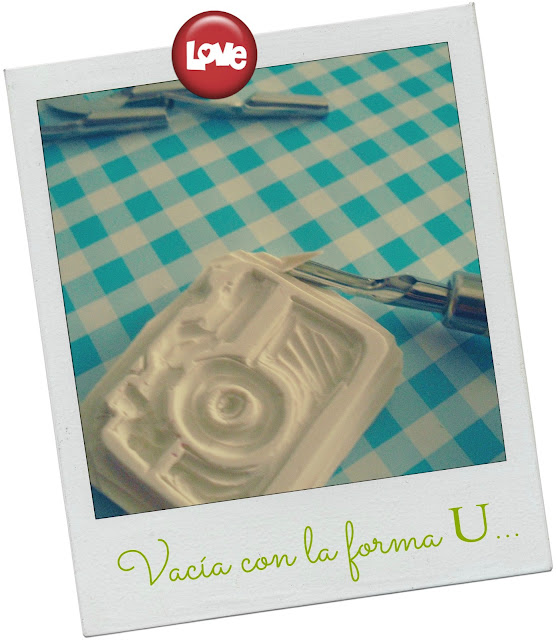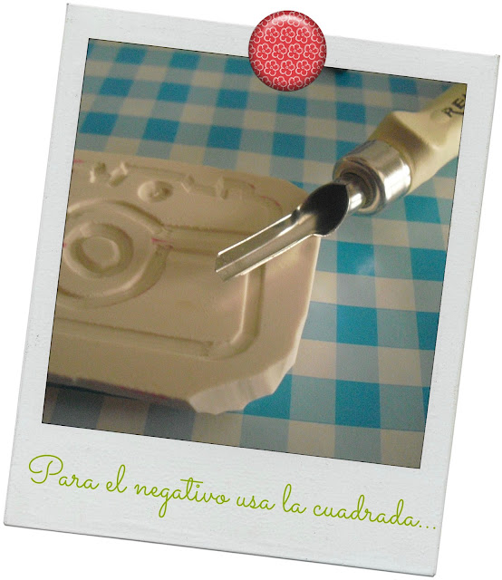 Muchisimo cuidado con los retoques, el más minimo mordisquito para quitar una puntita que se ha quedado sin retirar puede suponer la fatalidad para el sello, yo misma he tenido que descartar alguno que otro por culpa de los retoquitos... a la hora de carvar tened paciencia y pulso firme... despacito se hace mejor!, nada de carvar al aire! apoyaos en una buena superficie plana y estable, sujetad el sello con la mano que no sotenga la gubia (lo digo así por si hay zurd@s leyendo esto jejeje), y para las zonas redondeadas haced un único trazo haciendo girar la goma con la otra mano... Ya podemos empezar a carvar..., lo ideal es marcar los trazos con la gubia en forma de V.