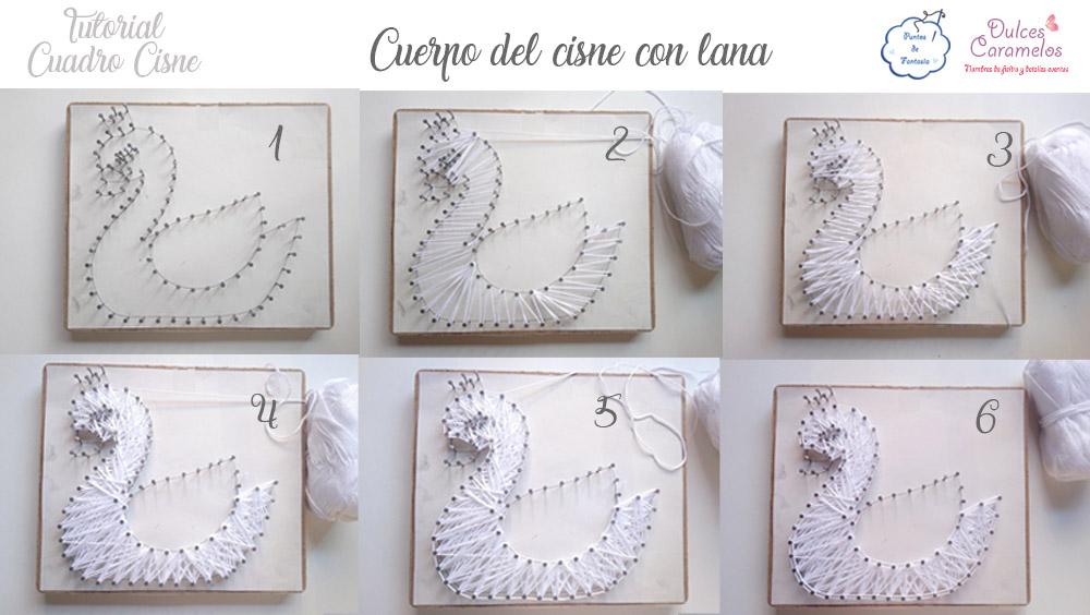 La tercera y cuarta pasada, piensa que estas coloreando el cisne y envuelve la lana en los clavos, por ejemplo nosotras en las curvas hemos escogido un clavo del que la lana se iba abriendo como ramas, simulando la curvatura.