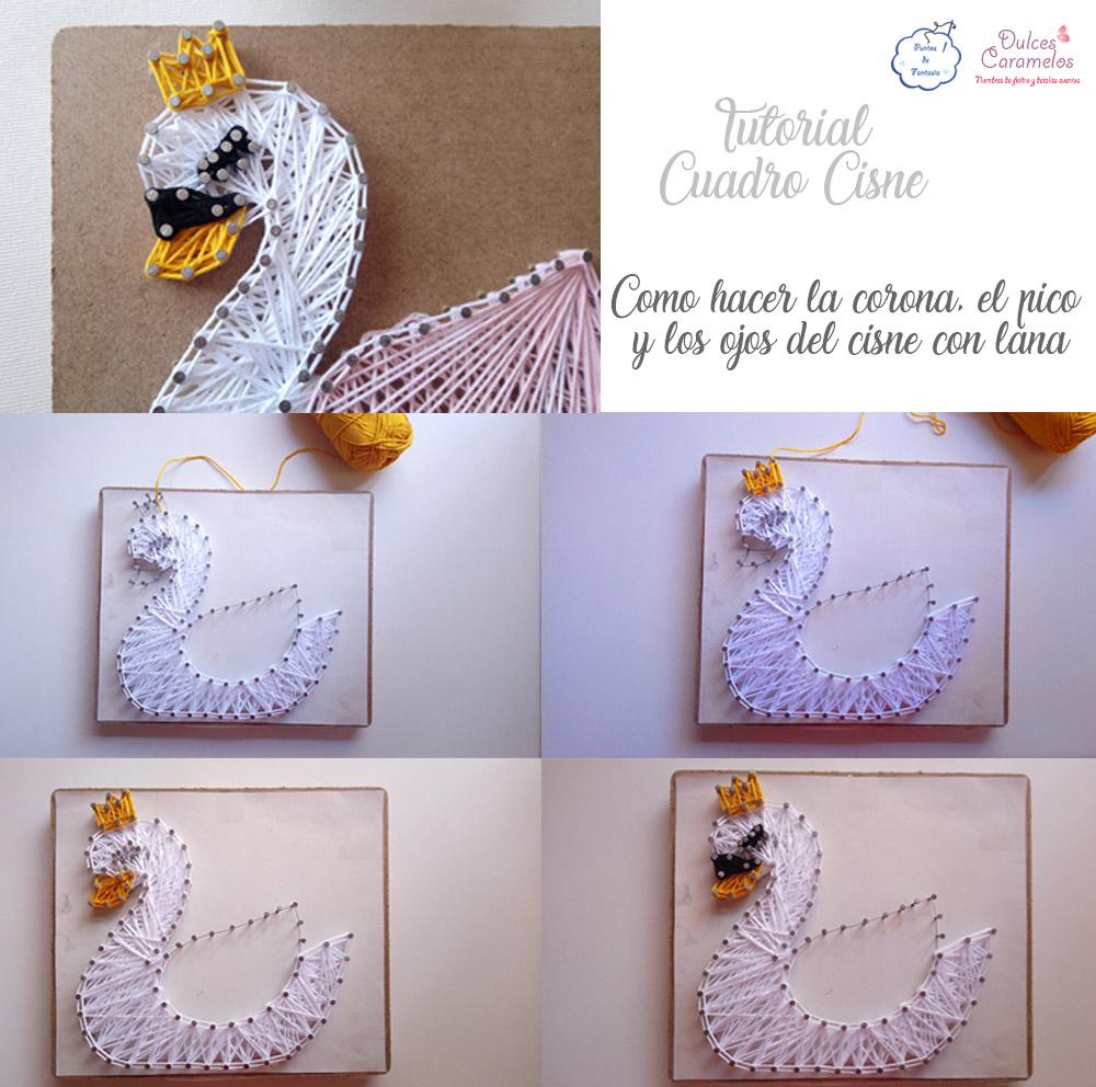 Una vez que tenemos la base blanca del cisne, tenemos que hacer la corona y pico dorado primero; y pico y ojos negros después, para que la lana quede por encima del paso anterior.