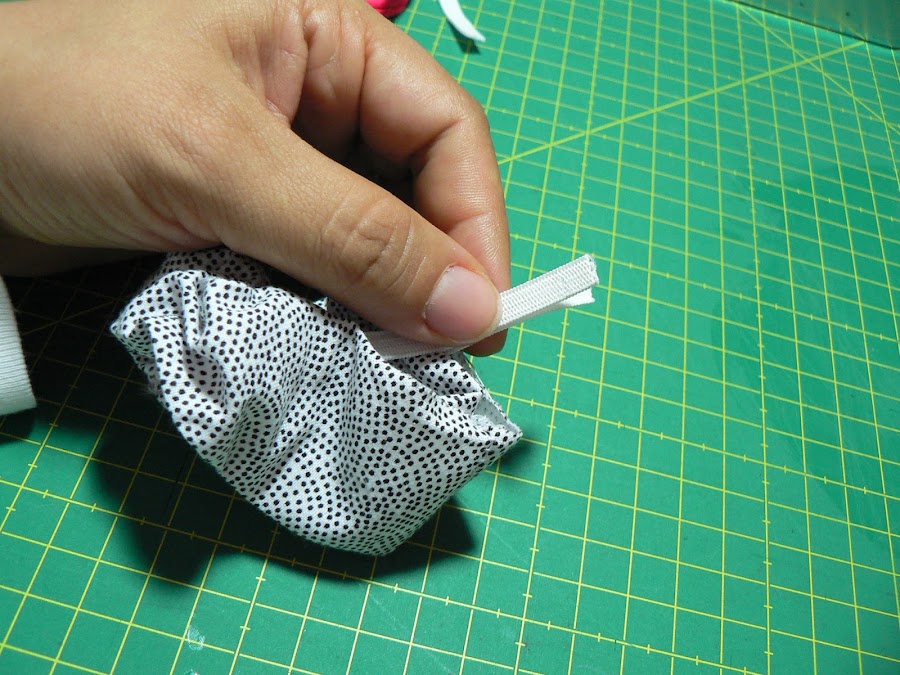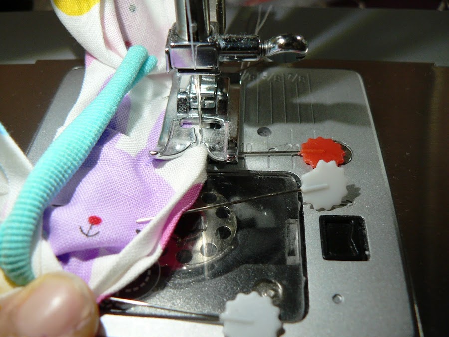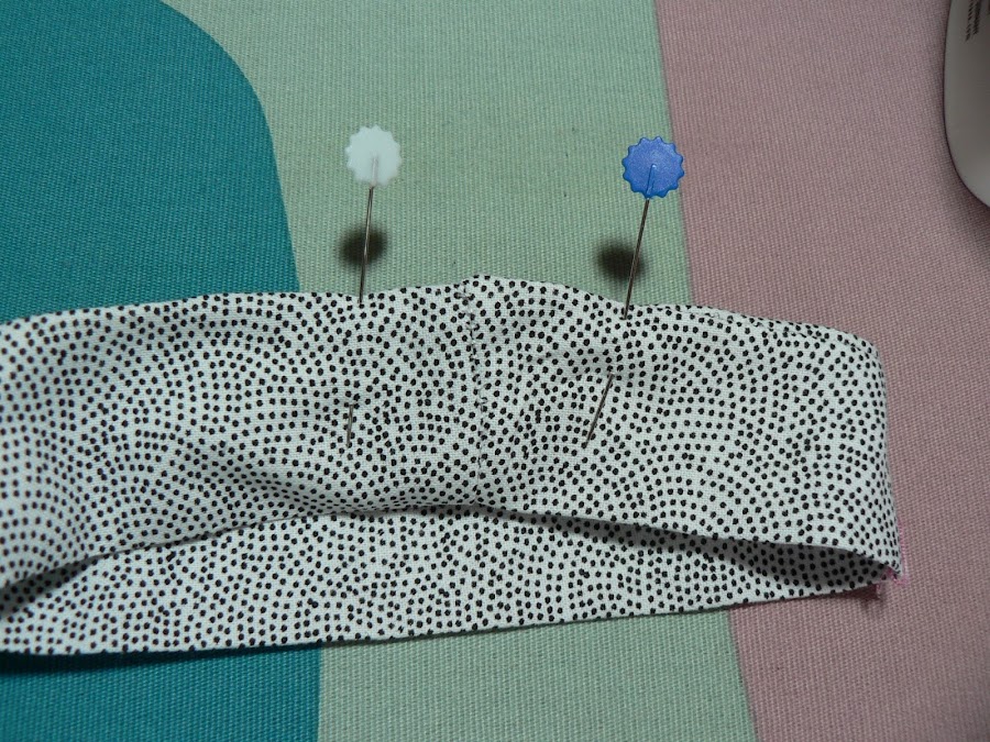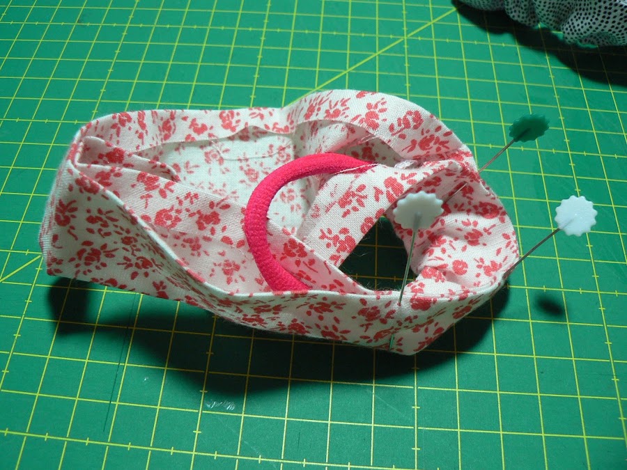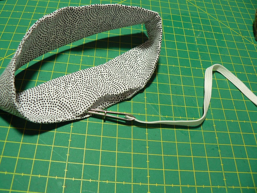 Introducimos la goma con un pasacintas. La goma es mucho más corta que la tela con lo que es fácil perder el final dentro de la tela. Para que esto no te pase, sujeta un extremo del elástico con un alfiler al coletero e introduce el otro extremo en la tela.