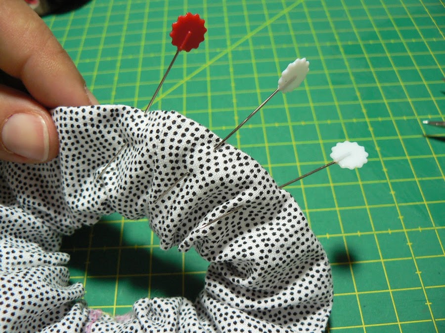 Sujetamos con alfileres y cosemos todo el contorno a mano con puntada escondida.