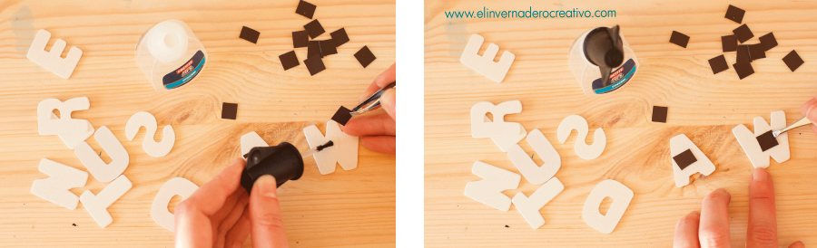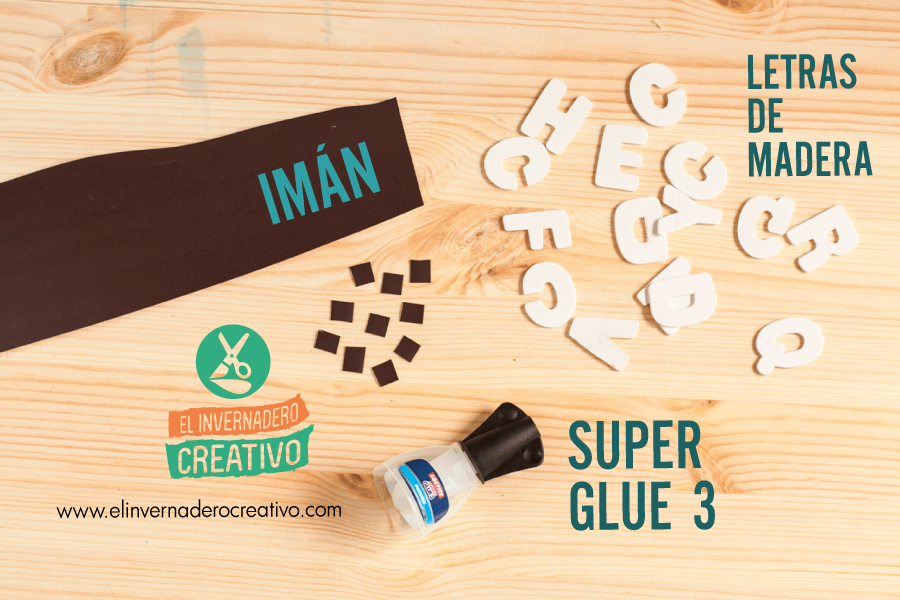 A continuación vamos a preparar las letras. Con el mismo Super Glue pega los imanes a las letras.