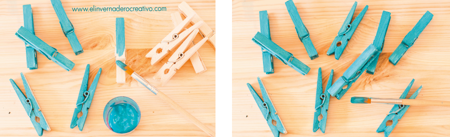 Pinta también las pinzas y déjalas secar. La parte de atrás déjala sin pintura para aplicar el pegamento ¿Cuántas pinzas vas a poner en tu colgador de pinzas? Yo he puesto 10 para que me coincidan con las letras de la palabra Wanderlust, quizás tu prefieras poner otra cosa. Este azul combina genial con el negro.