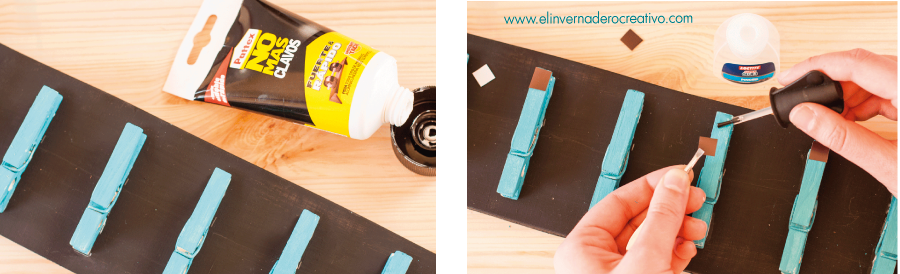Ya tenemos la mitad del trabajo hecho. Ahora cuenta cuántas pinzas tienes y cómo distribuir el espacio para que queden centradas. Mide con la regla y marca con el lápiz la posición. Una vez marcadas es hora de pegarlas. Aplica un poco de Pattex No más Clavos, ten en cuenta que es un pegamento muy potente y se necesita poca cantidad.