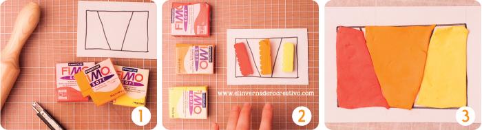 Vamos a utilizar FIMO de tres colores diferentes. Necesitaremos también un rodillo, de madera o de plástico, una plantilla con la forma que muestra la imagen 1 y un cutter. Para empezar cortaremos tres trozos de fimo, uno por cada color que vamos a utilizar. A continuación con ayuda del rodillo los aplastamos para hacer una lámina fina. Una vez que tengas la lámina recórtala con la forma del patrón, como muestra la imagen 3.