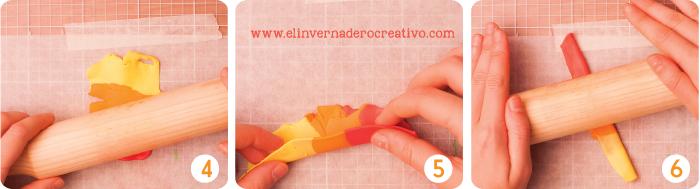Cuando tengas el patrón completo retira la plantilla y comienza a estirarlo con ayuda del rodillo. OJO hay que hacerlo durante muchas pasadas, unas 20 o 25 aproximadamente. La masa se te irá estirando y tendrás que ir parando para doblarla, hazlo siempre ne la misma dirección, como muestra la imagen 5. Sigue entonces amasando con el rodillo hasta que el degradado esté a tu gusto.