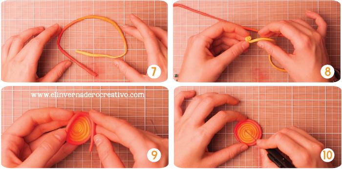 Ya tenemos la parte del degradado terminada, imagen 7. Ahora vamos a por el colgante. En esta ocasión he realizado una espiral, enrollando una tira larga del fimo degradado, hasta conseguir el tamaño deseado. Para darle un toque personal he añadido unos pequeños cortes con el cutter.