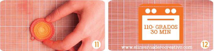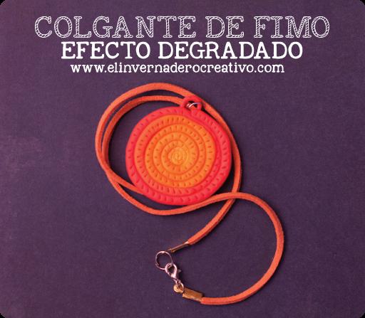 Para terminar he añadido un pequeño enganche con un trocito de fimo y lo he metido en el horno, a 110º durante 30 minutos. Cuando lo saques, cuidado que quema, ya tendrás listo tu colgante degradado.