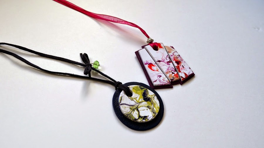 Se trata, como ya habrás visto en el título, de decorar unos colgantes de arcilla polimérica blanca con esmaltes de uñas, creando un efecto mármol.