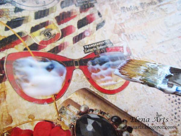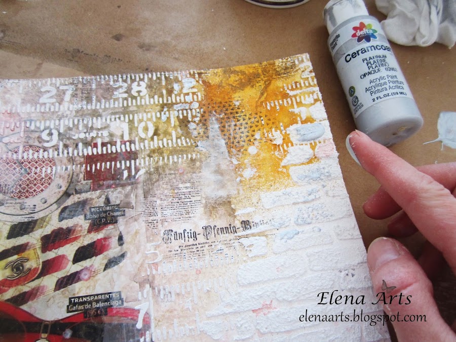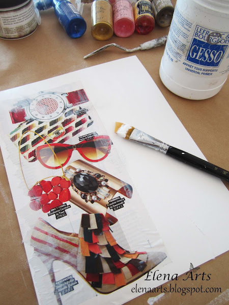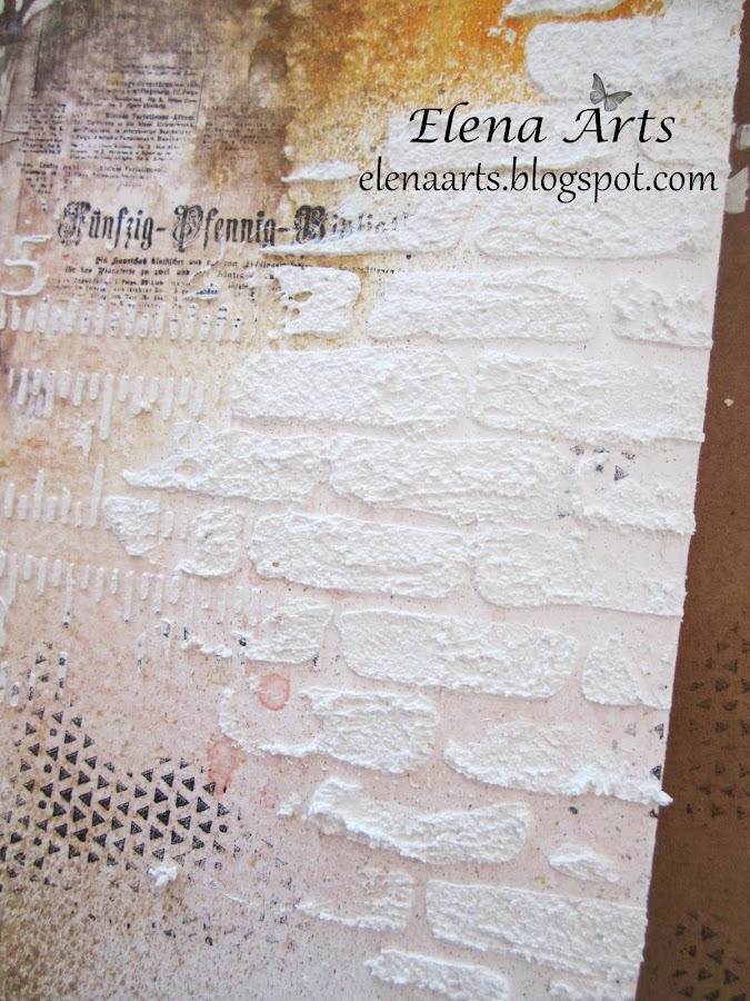 With white gesso, I glued the paper and reviewed it over with the same brush with gesso. The rest covered it with transparent gel (can be replaced with transparent gesso).