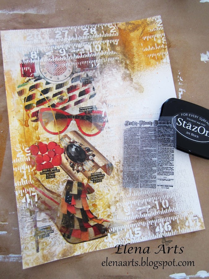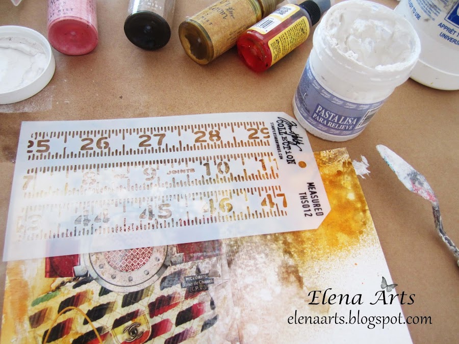 Well, I prepared my paints, gesso, templates, stamps, a sheet of water color paper and a page of a magazine.