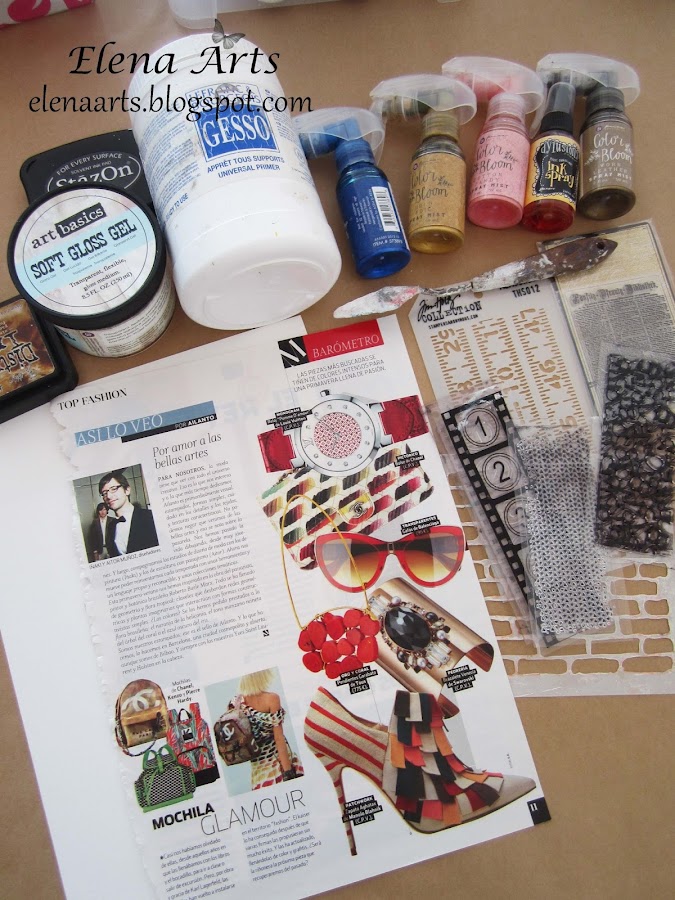 Bueno, preparé mis pinturas, el gesso, algunas plantillas, sellos, una hoja de papel de acuarela y una página de una revista.